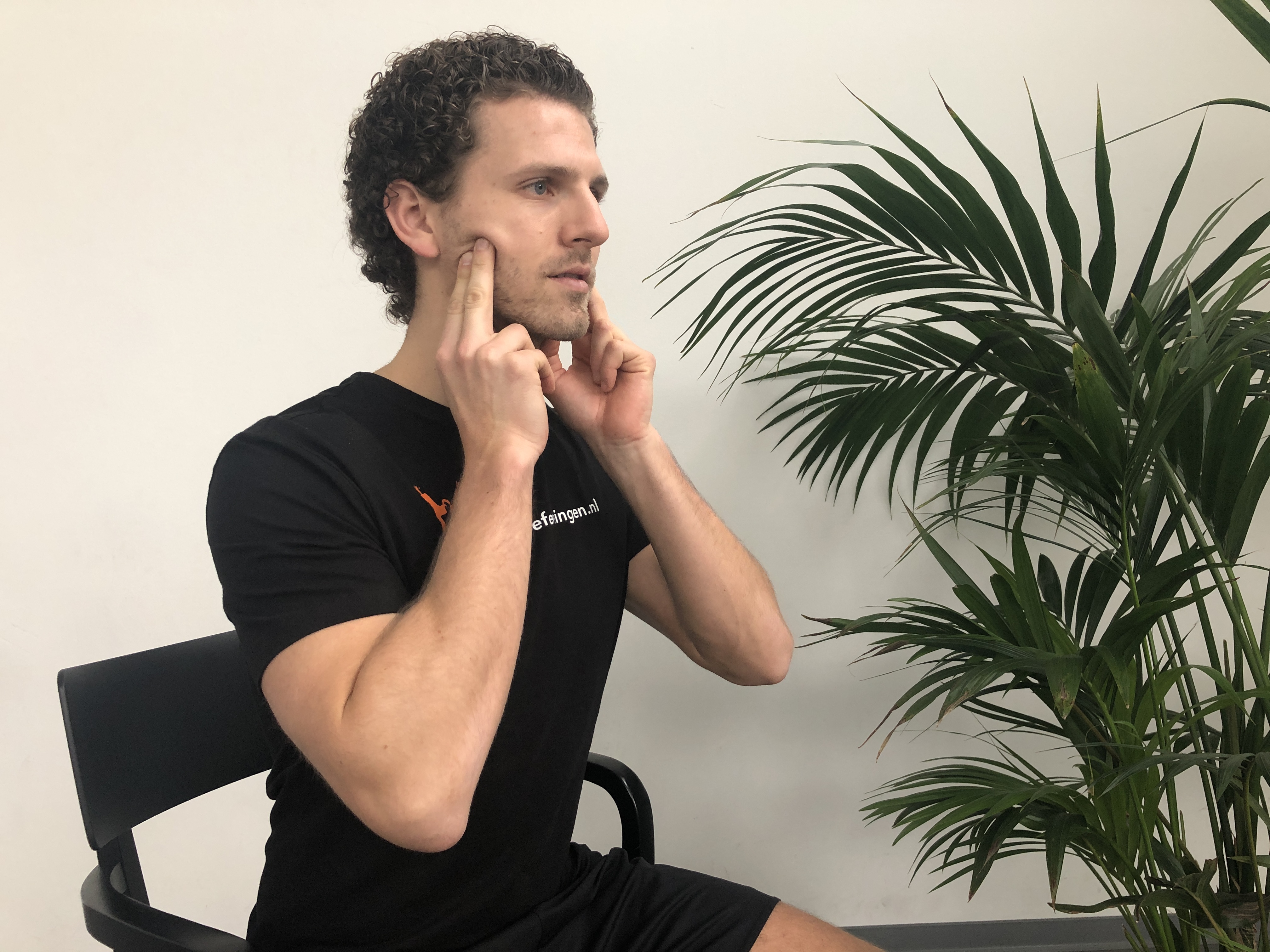 Plaats de vingers aan de buitenkant van de wang op het kaakgewricht, plaats aan de binnenzijde de duim achter de laatste kiezen aan de binnenkant van de wang (hier voel je een spier), geef nu wat druk van binnenuit richting de vingers aan de buitenkant. Zo kan je zelf de kaakspieren masseren.